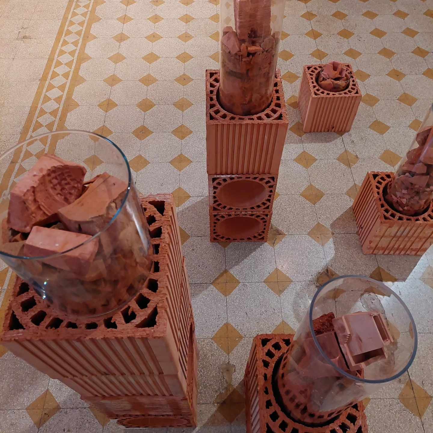 The micro-architecture were cast from a mixture of brick dust and plaster, housed in glass cylinders that evoke preservation and fragility.